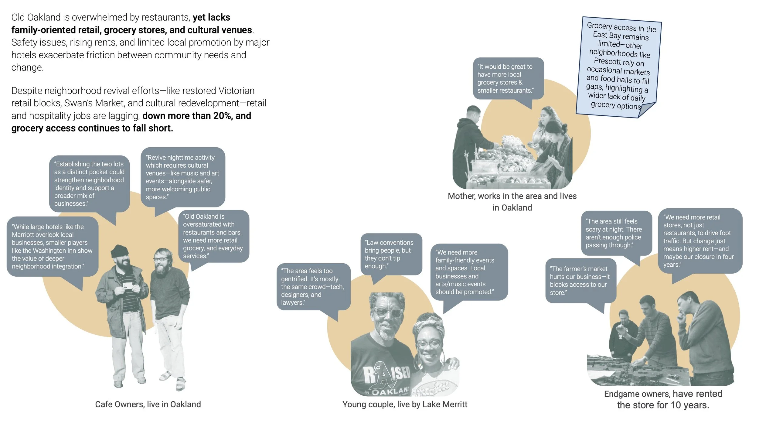 Together, these strategies framed a vision for Old Oakland as a lively, inclusive district, blending heritage and innovation to strengthen its identity and economic vitality. By layering cultural programming with adaptive urban design, the proposal positioned Old Oakland to evolve into a place where history and contemporary city life meet.