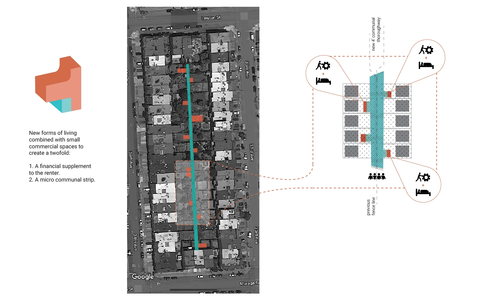 At its core, the concept asks private landowners to contribute a 2.5-foot strip from their rear setbacks, combining them into a 5-foot “micro communal strip” dedicated to public circulation, gardens, and shared spaces. In exchange, landowners gain the right to build accessory dwelling units (ADUs) and, in some cases, commercial workspaces on their lots. Collective management by a homeowners’ association ensures long-term stewardship and community decision-making.