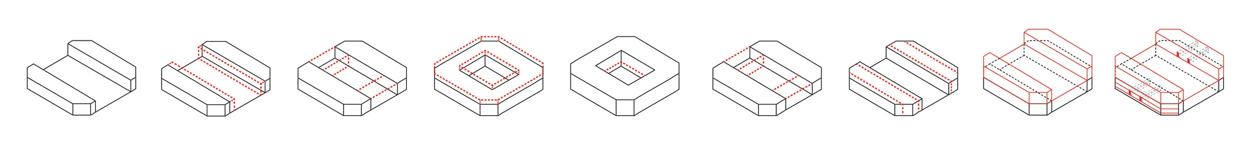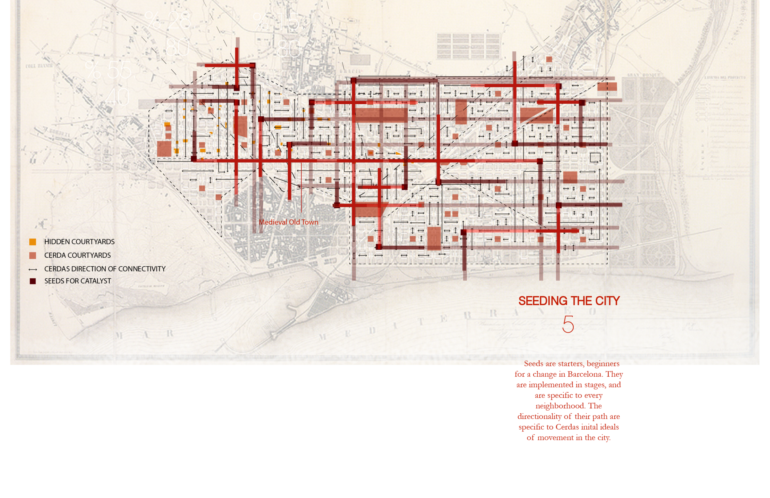 Our approach started by planting initial “seed blocks” into Barcelona’s already dense and defined fabric, allowing for new territories to emerge while the centers of existing neighborhoods shift. The “seed block”, a corner condition that can only grow in two directions, stitches adjacent blocks together--condensing the urban block through physical continuity yet porosifying through circulation. This new, compressed connection inverts conventional boundaries of living (interior) and urban (exterior) programs (within the existing block and above it) and the overall hierarchical reading of edges-- the figure-ground reading of Barcelona transforms into gray edge territories.