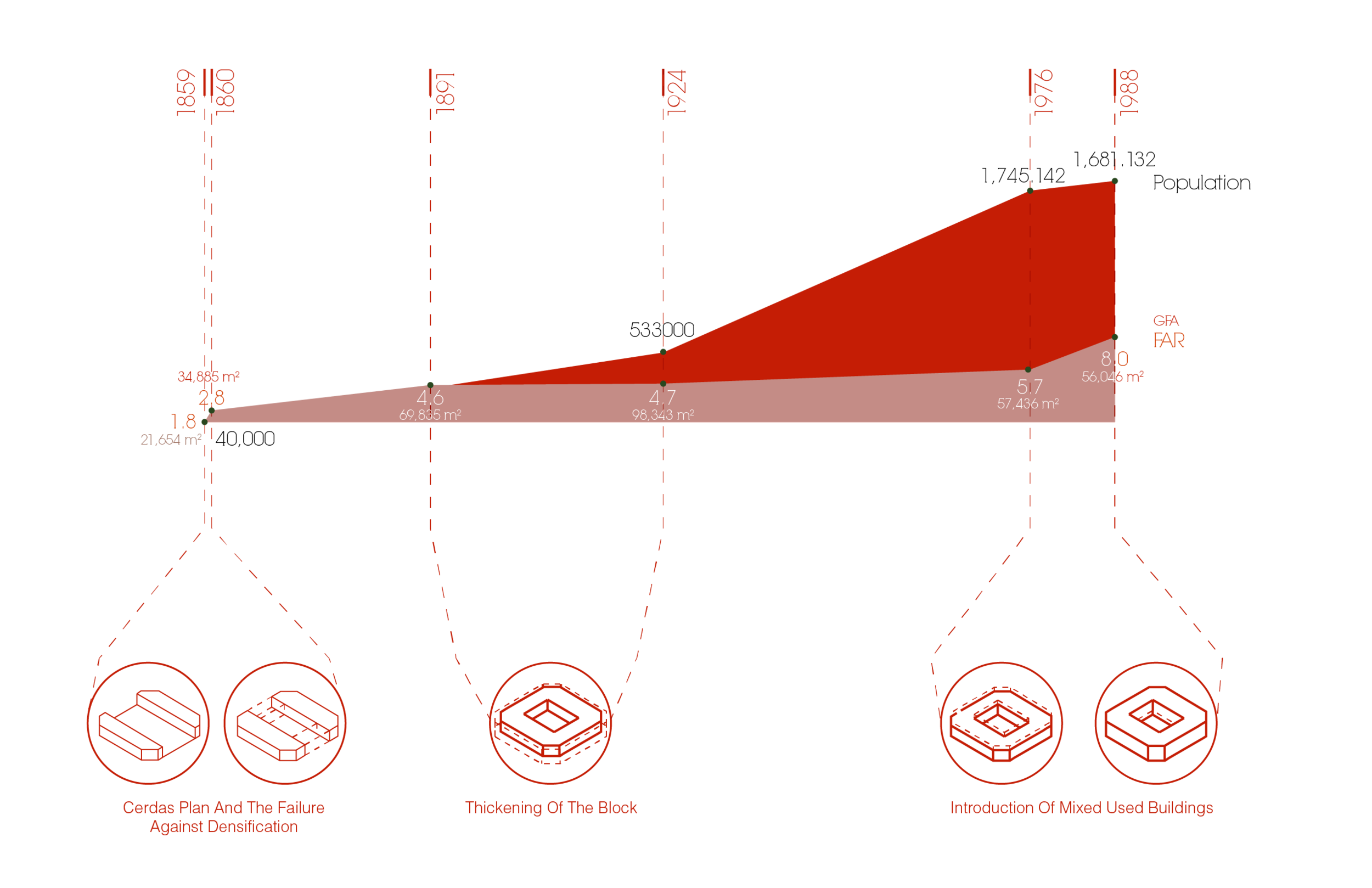 At the urban scale, it straddles in between Cerda’s classical ideals of continuity and the contemporary needs for urban density and lightness. At the block size, it straddles in between public street life and Barcelona’s hidden courtyards. The inversion of edges at the programmatic scale further blends interior life with the public courtyard and city with the neighborhood.