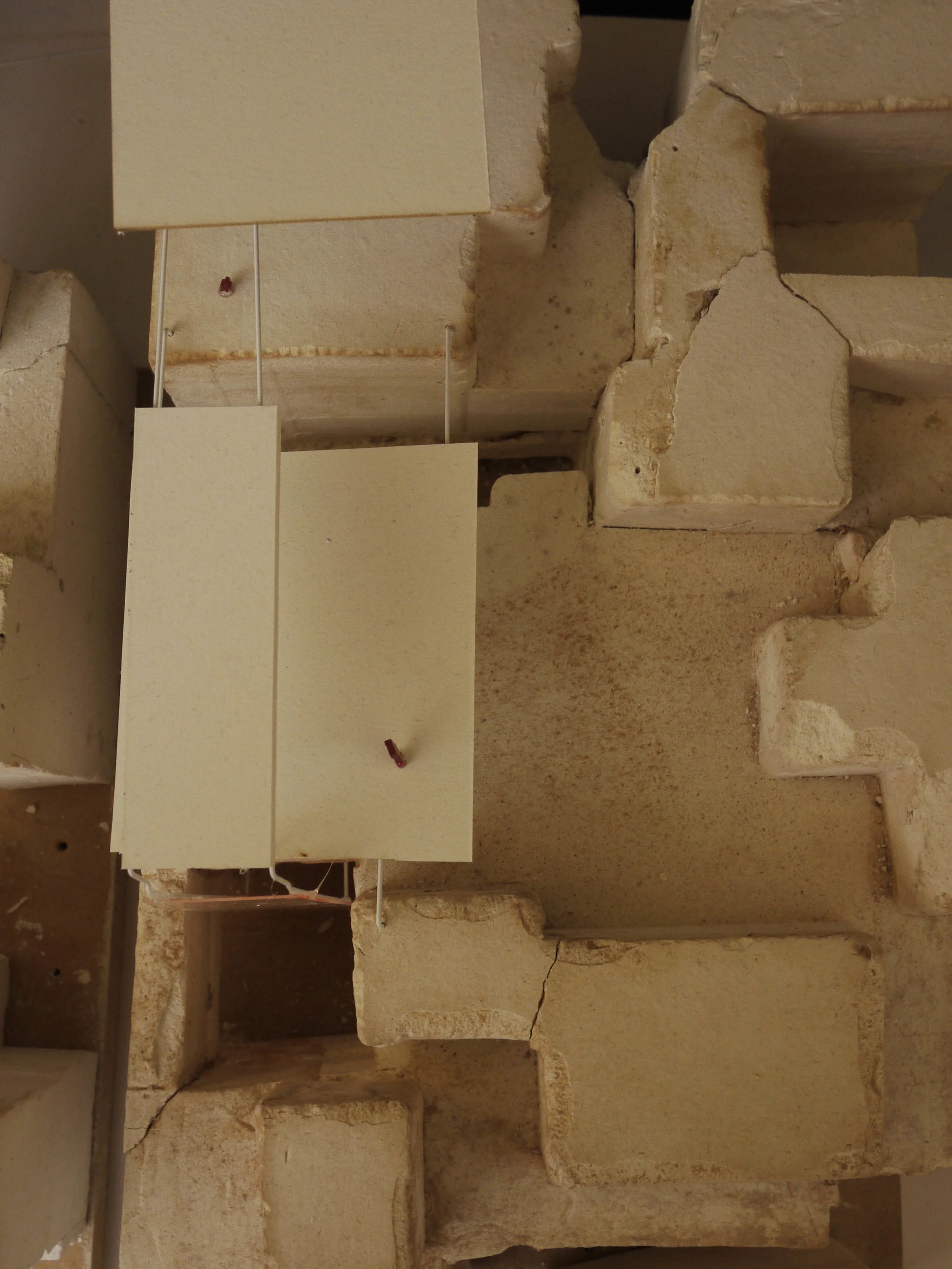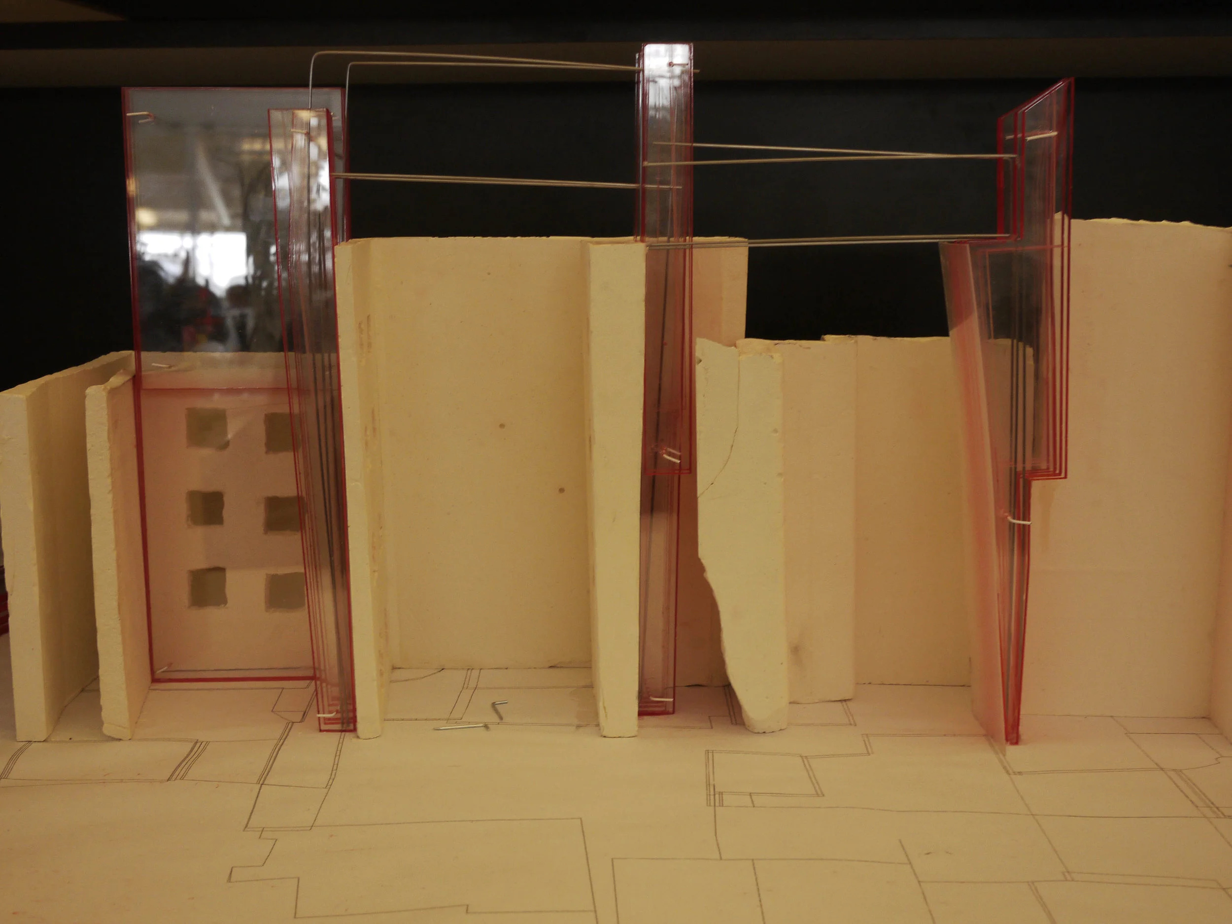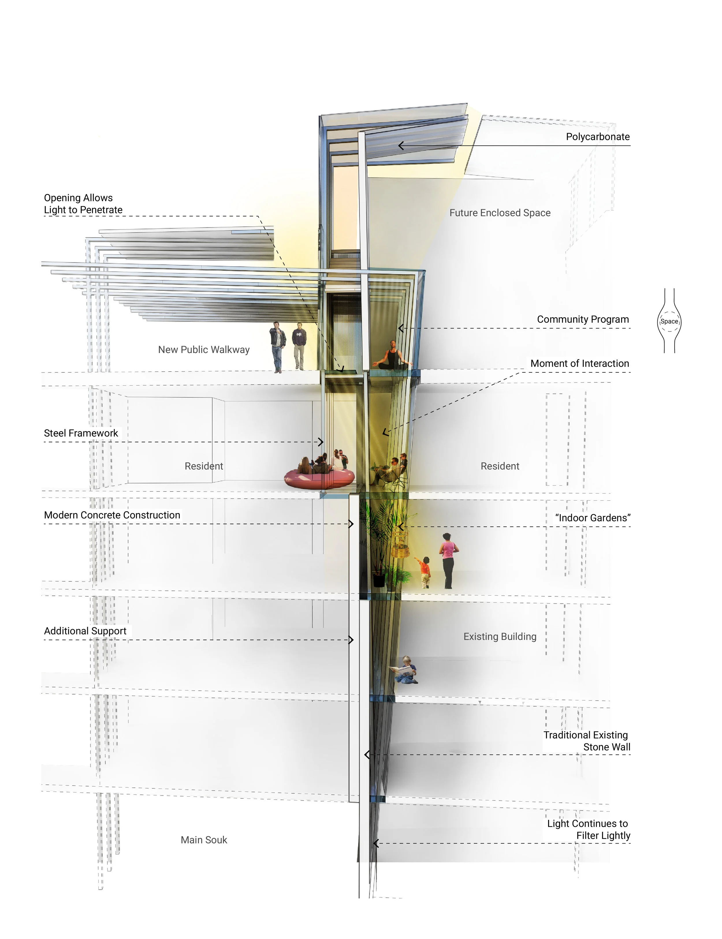 Party walls in the old city grew from thick stone walls to the contemporary thinner concrete wall. The proposed imagined shared spaces out of a steel structure framework that embeds in the existing walls as part of a cause and effect system to always maintain light and space;